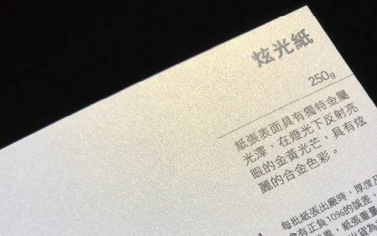 鵝白色紙張,紙張硬實且表面有細紋,印刷後表現出立體及若隱若現的金屬光澤感。